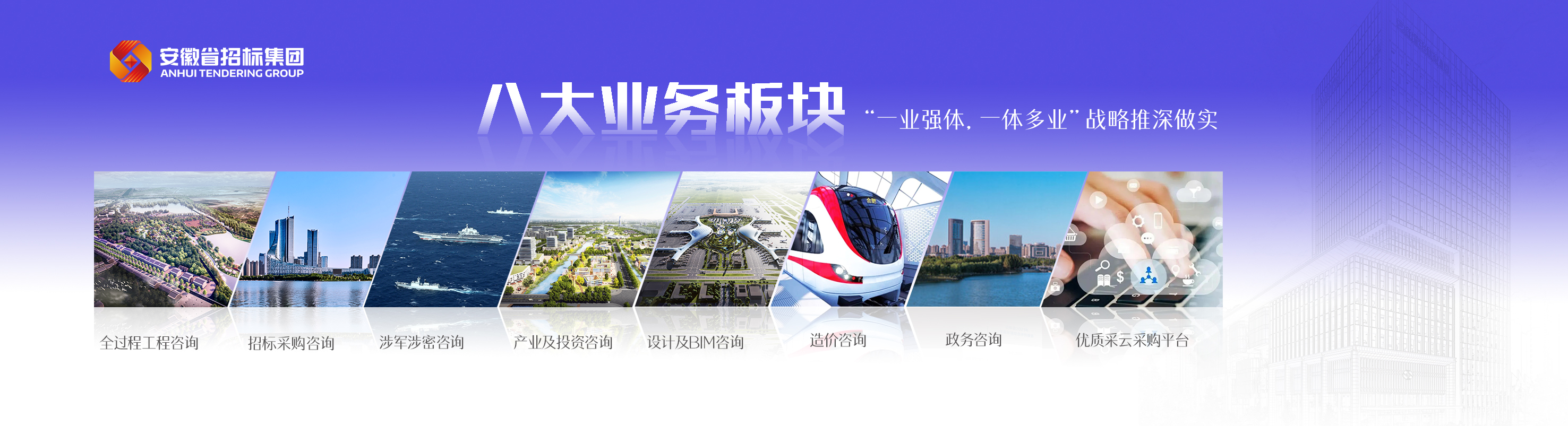 集團堅持“一業強體,一體多業”的發展戰略,立足招標采購服務,聚焦建設工程全過程咨詢業務鏈,融合發展產業與投資咨詢、涉軍涉密咨詢、設計及BIM咨詢、造價咨詢、政務咨詢、優質采云采購平臺等八大業態,具有工程咨詢單位甲級綜合資信及甲級專業專項資信……